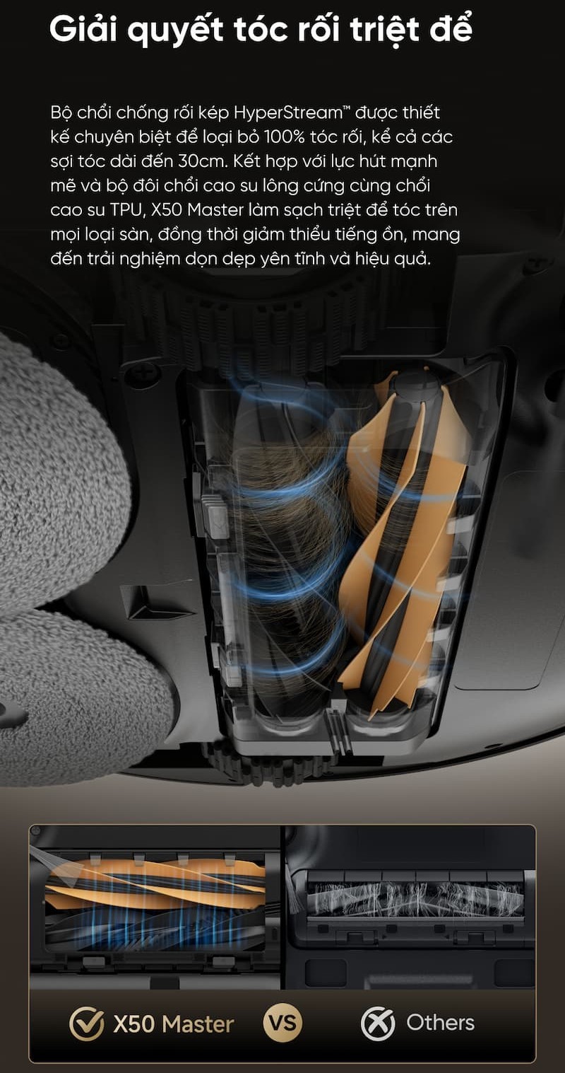 Dreame X50 Master được trang bị chổi kép HyperStream™ – giải pháp vượt trội cho tình trạng tóc rối và lông thú quấn quanh chổi, đặc biệt hiệu quả với tóc dài đến 30 cm.