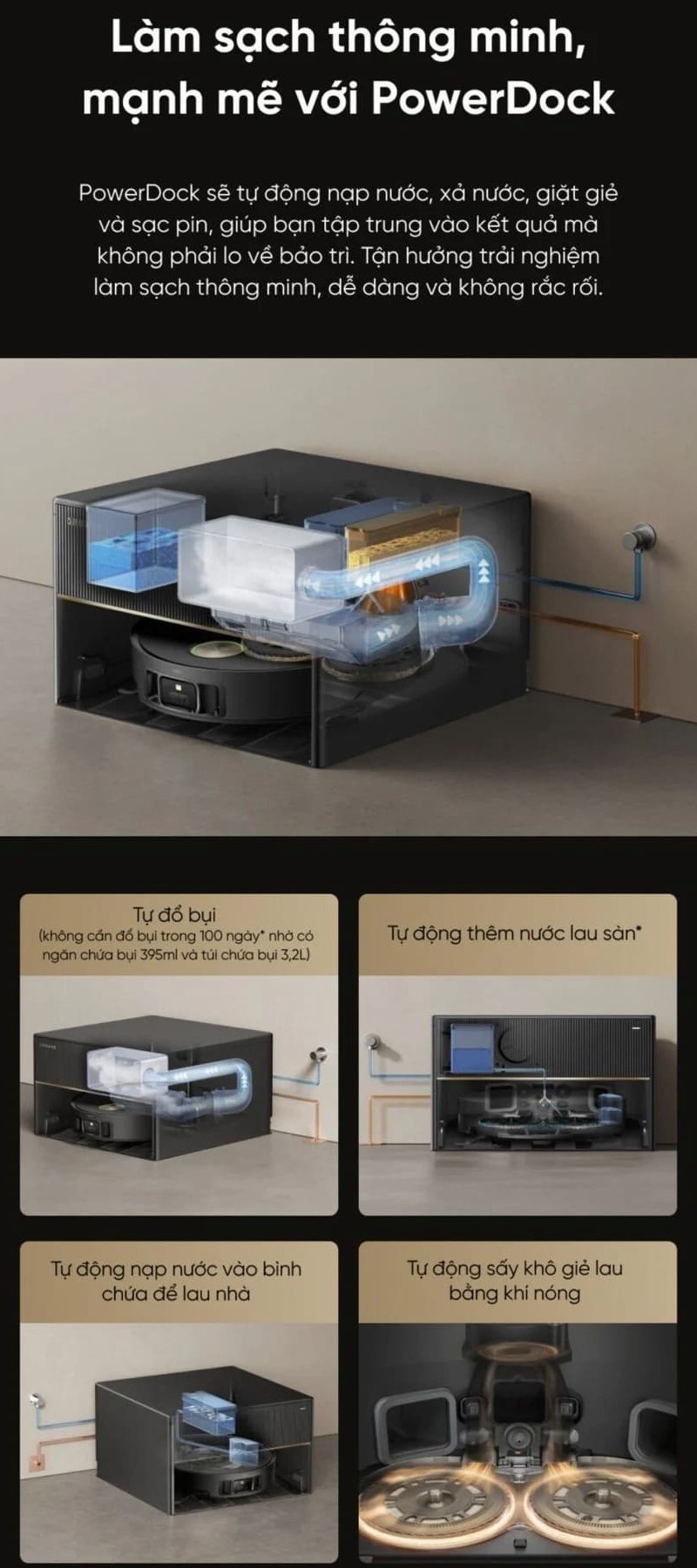 Trạm đế PowerDock™ tích hợp 8 chức năng: tự động đổ rác vào túi dung tích 3.2l, giặt giẻ với nước nóng 80 °C, khử khuẩn UV và sấy khô bằng khí nóng, giúp giẻ luôn sạch sẽ, khô ráo và sẵn sàng cho chu trình tiếp theo.