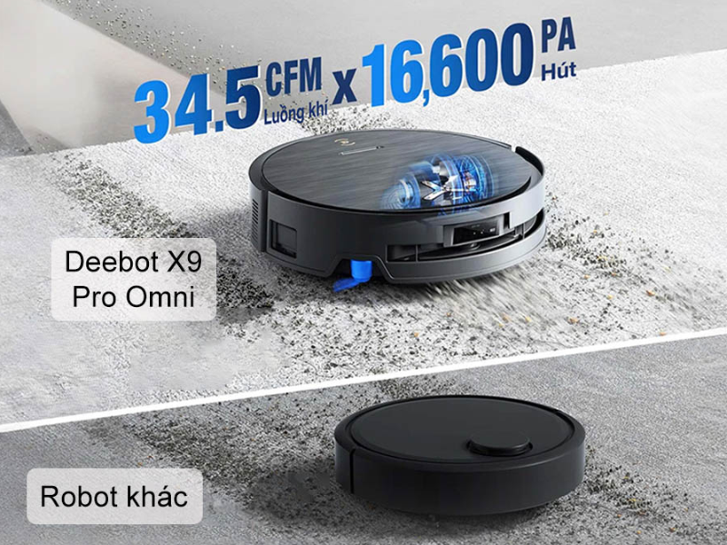 Cùng với đó, Ecovacs X9 Pro Omni còn được trang bị viên pin Pouch chuẩn EV với dung lượng 6.400mAh, có tuổi thọ cao gấp 2.4 lần pin truyền thống. Nhờ sự kết hợp này, robot đạt lưu lượng khí lên đến 16.3 lít/giây, tương đương khoảng 34.5 CFM, cao hơn 49% so với các hệ thống hút bụi thông thường. Đặc biệt, lực hút cực đại 16.600Pa giúp X9 Pro Omni loại bỏ bụi bẩn nhanh chóng, đồng thời cải thiện hiệu suất hút sâu trên thảm tới 137.6%. Không chỉ bụi mịn mà cả mảnh vụn lớn cũng được thu gom triệt để mà không để lại cặn bẩn.