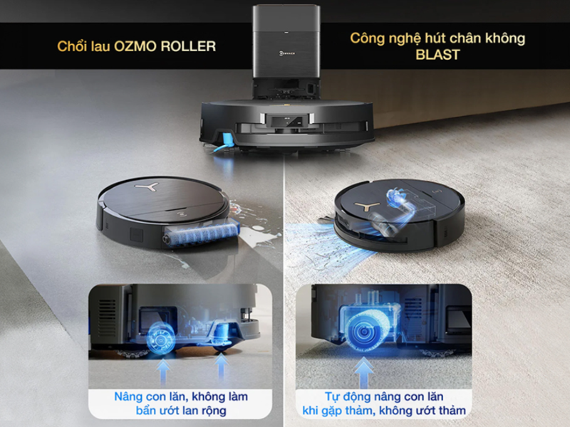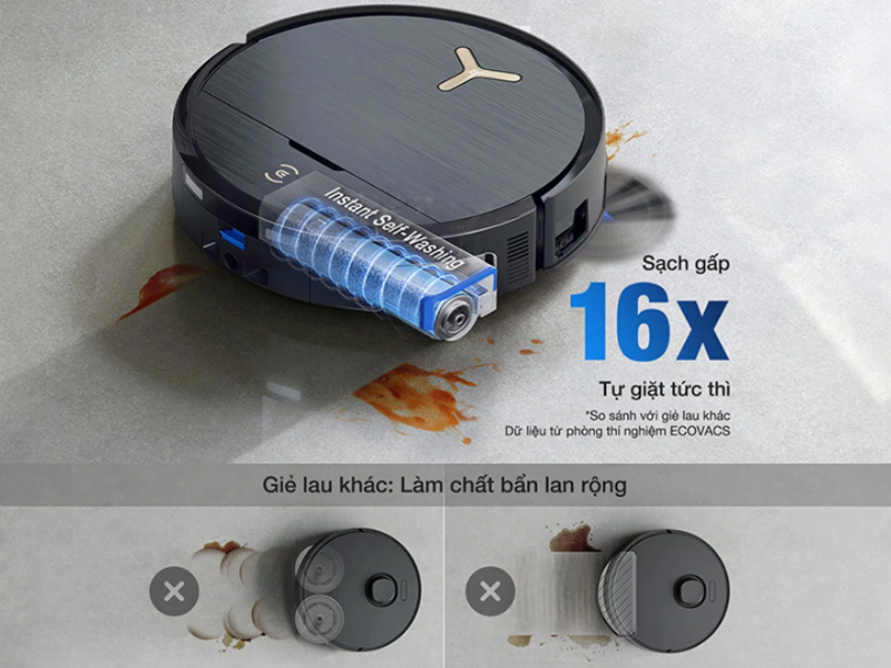 Khác biệt lớn nhất của Ecovacs X9 Pro Omni so với thế hệ trước chính là công nghệ OZMO ROLLER. Đây là giải pháp lau sàn chuyên sâu được Ecovacs phát triển dựa trên nền tảng của X8 Pro nhưng nâng cấp toàn diện cả về cơ chế hoạt động lẫn hiệu quả. Công nghệ này sử dụng một con lăn quay tốc độ cao 220 vòng/phút, kết hợp với áp lực đè xuống mặt sàn lên tới 3.700Pa, mang lại hiệu quả làm sạch gấp 16 lần so với các hệ thống lau rung hoặc đĩa kép truyền thống.