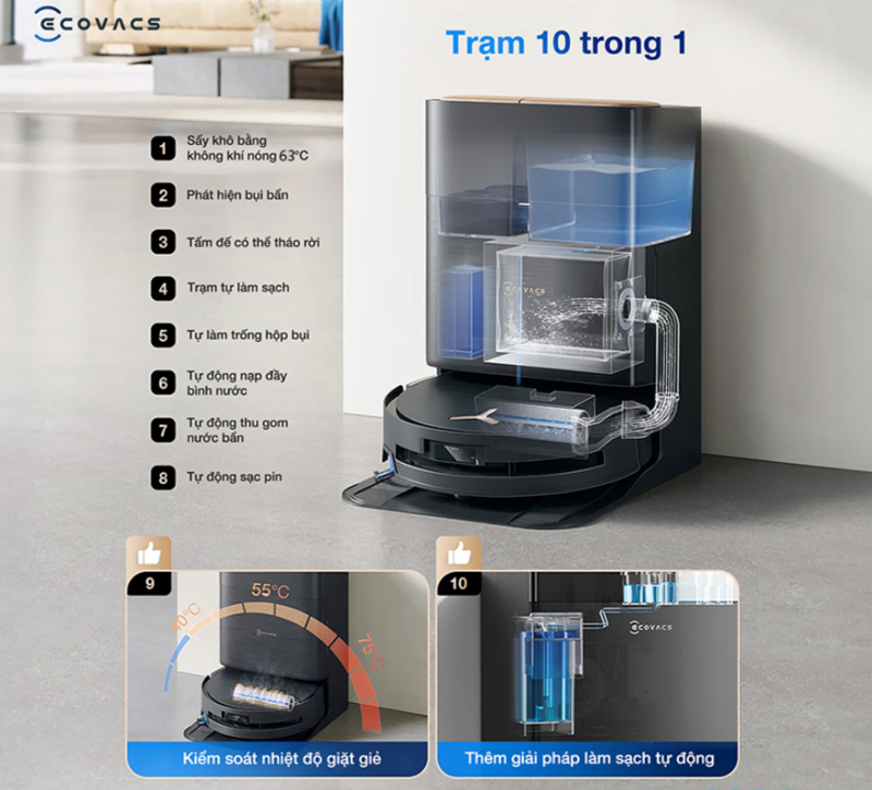Một điểm nổi bật giúp Ecovacs X9 Pro Omni vượt trội so với các sản phẩm khác là trạm sạc Omni thế hệ mới. Không chỉ đóng vai trò nạp pin, trạm còn là một trung tâm bảo trì tự động giúp tối giản mọi thao tác vệ sinh thủ công.