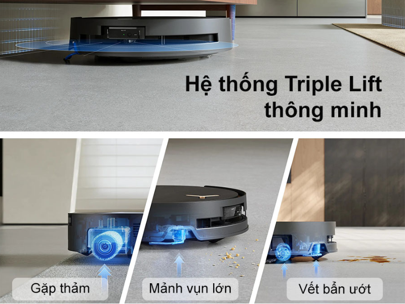 Ecovacs X9 Pro Omni tích hợp hệ thống Triple Lift hoàn toàn mới, cho phép robot điều chỉnh linh hoạt độ cao và lực hút trong từng tình huống thực tế. Khi di chuyển lên thảm, robot sẽ tự động nâng giẻ lau để tránh làm ướt, đồng thời tăng lực hút để làm sạch bụi bẩn ẩn sâu trong sợi vải. Khi gặp vết bẩn ướt, cả chổi chính và chổi phụ được nâng lên để tập trung xử lý vết bẩn bằng chế độ lau chuyên sâu.