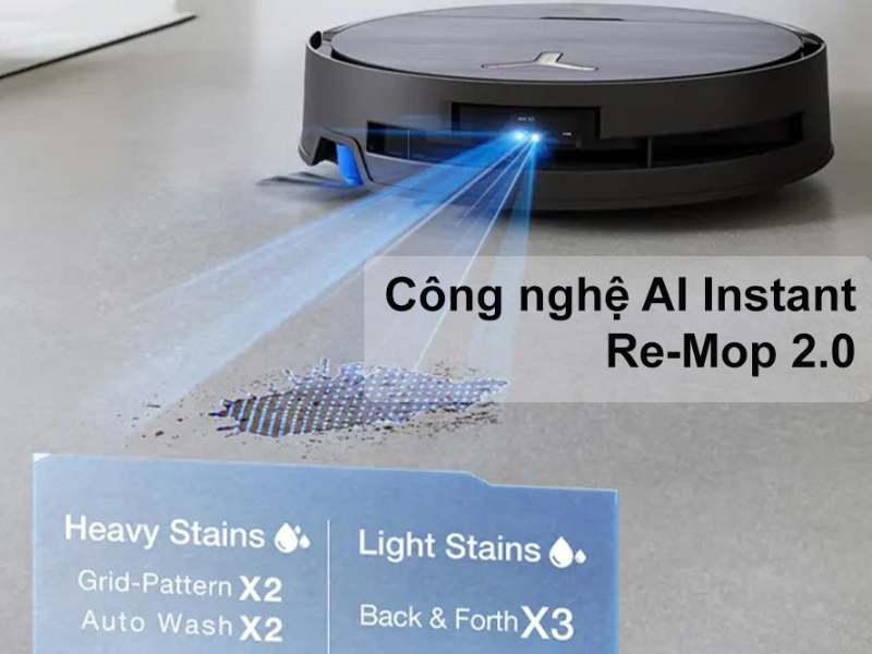 AI Instant Re-Mop 2.0 mang đến cho Ecovacs X9 Pro Omni khả năng phân tích vết bẩn và đưa ra phương án xử lý phù hợp. Với các vết bẩn nhẹ như nước ngọt hay sữa, robot sẽ tự động lau 3 lần để đảm bảo sạch hoàn toàn. Trong trường hợp gặp các vết bẩn cứng đầu như cà phê, nước tương, robot áp dụng quy trình lau sâu theo dạng lưới, bắt đầu từ mép ngoài và di chuyển vào giữa. Kết hợp với cơ chế tự giặt con lăn, robot có thể lặp lại chu trình nhiều lần nếu cần, giữ cho mặt sàn luôn đạt độ sạch tối ưu mà không làm ảnh hưởng đến bề mặt.
