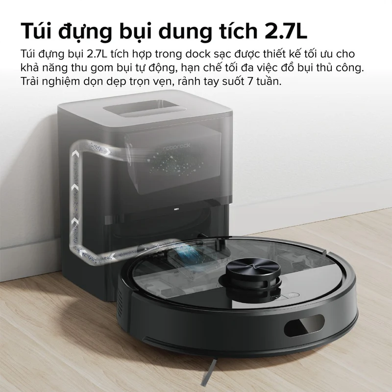Bên cạnh đó, hộc chứa bụi dung tích lớn giúp robot có thể tiếp nhận lượng bụi khổng lồ mà không cần dừng lại để đổ rác thường xuyên. Nhờ tính năng này, việc bảo trì trở nên đơn giản, tiện lợi, giúp người dùng tiết kiệm tối đa thời gian và công sức, giữ cho không gian sống luôn sạch sẽ mà không cần can thiệp liên tục.