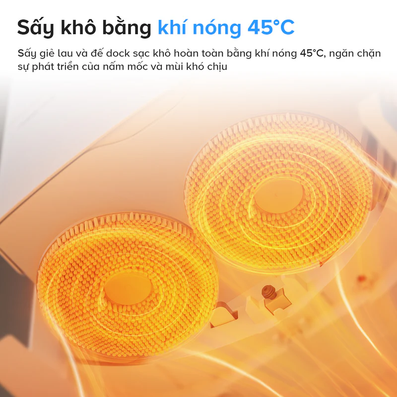Giẻ lau của Roborock Qrevo 5AE sau khi giặt sạch sẽ được sấy khô bằng khí nóng, giúp ngăn ngừa vi khuẩn và mùi hôi khó chịu. Quá trình sấy có độ ồn chỉ 45dB, tương đương tiếng thì thầm trong thư viện, đảm bảo không gây phiền nhiễu cho sinh hoạt gia đình.