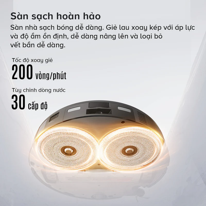 Sở hữu hệ thống giặt khăn lau bằng nước nóng tiên tiến, Roborock Saros 10R có thể làm sạch dễ dàng cả những vết bẩn cứng đầu hay dầu mỡ bám vào khăn lau. Với bình chứa nước 69ml tích hợp trên robot, đảm bảo tấm vải lau luôn được giữ ẩm vừa đủ, tránh tình trạng bị khô trong quá trình lau dọn. Nước được điều chỉnh linh hoạt với 30 mức khác nhau, cùng tốc độ lau xoay kép 200 vòng/phút, đảm bảo loại bỏ 99.99% vi khuẩn trên mặt sàn.
