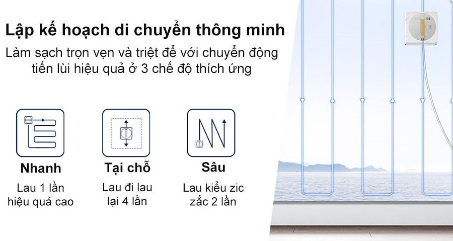 Winbot W1 Pro được trang bị công nghệ lập kế hoạch đường dẫn thông minh WIN-SLAM 3.0, giúp robot di chuyển hiệu quả và làm sạch toàn bộ bề mặt kính. Nhờ công nghệ này, robot có thể lên kế hoạch di chuyển có trật tự, không bỏ sót hoặc lặp lại khu vực đã lau, đảm bảo hiệu quả làm sạch tối ưu. Ngoài ra, W1 Pro còn cung cấp nhiều chế độ lau linh hoạt, phù hợp với từng loại kính và nhu cầu sử dụng khác nhau.