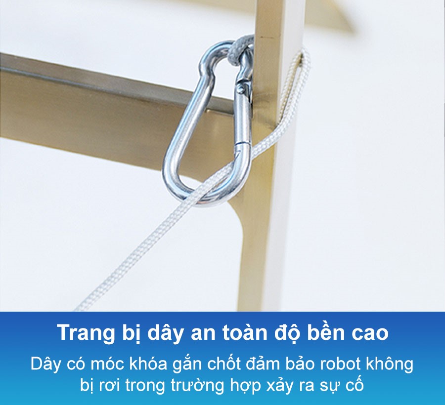 Ngoài ra, dây còn có móc khóa an toàn được thiết kế chắc chắn, giúp cố định dây an toàn và đảm bảo robot không bị rơi trong trường hợp xảy ra sự cố. Nhờ vậy, bạn có thể hoàn toàn yên tâm sử dụng robot mà không lo lắng về nguy cơ rơi vỡ hay hư hỏng.
