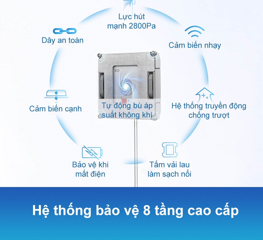 - Khả năng phát hiện và cân bằng áp suất không khí siêu nhanh: Giúp robot di chuyển ổn định và an toàn trên mọi bề mặt kính.