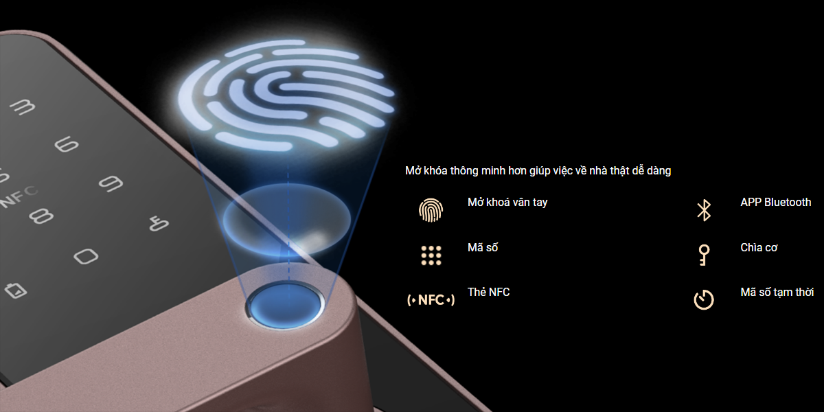 - Mở khóa các cách: Vân tay / mã PIN / thẻ NFC / Bluetooth / Chìa khóa cơ