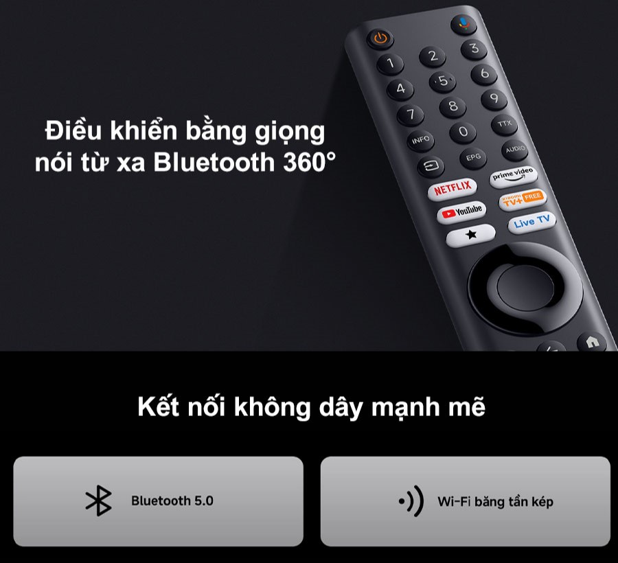 Remote điều khiển đi kèm hỗ trợ Bluetooth 5.0 với khả năng nhận tín hiệu 360°, cho phép bạn điều khiển TV từ mọi góc độ trong căn phòng mà không cần hướng thẳng về thiết bị. Đặc biệt, tính năng điều khiển giọng nói thông minh giúp bạn dễ dàng tìm kiếm nội dung yêu thích, chuyển kênh hoặc bật tắt ứng dụng chỉ bằng một câu nói. Ngoài ra, các phím chức năng có thể tùy biến theo nhu cầu sử dụng, mang lại sự tiện nghi tối đa cho người dùng.