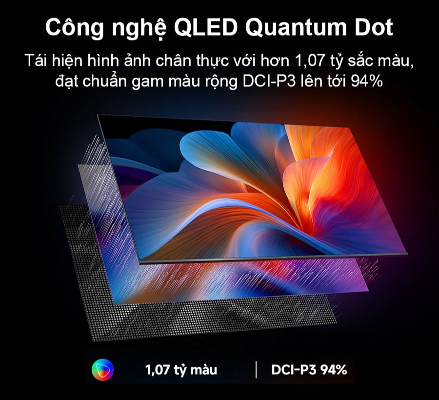 Sở hữu công nghệ Quantum Dot tiên tiến, màn hình QLED của tivi Xiaomi A Pro 43 inch QLED 2026 có thể tái hiện hình ảnh với hơn 1,07 tỷ sắc màu chân thực, đạt chuẩn gam màu rộng DCI-P3 lên tới 94%. Đây chính là tiêu chuẩn màu sắc được các nhà làm phim Hollywood tin dùng, giúp mỗi khung hình trở nên sống động, rực rỡ như bước ra từ cuộc sống thật, đưa bạn vào những phút giây giải trí trọn vẹn nhất.