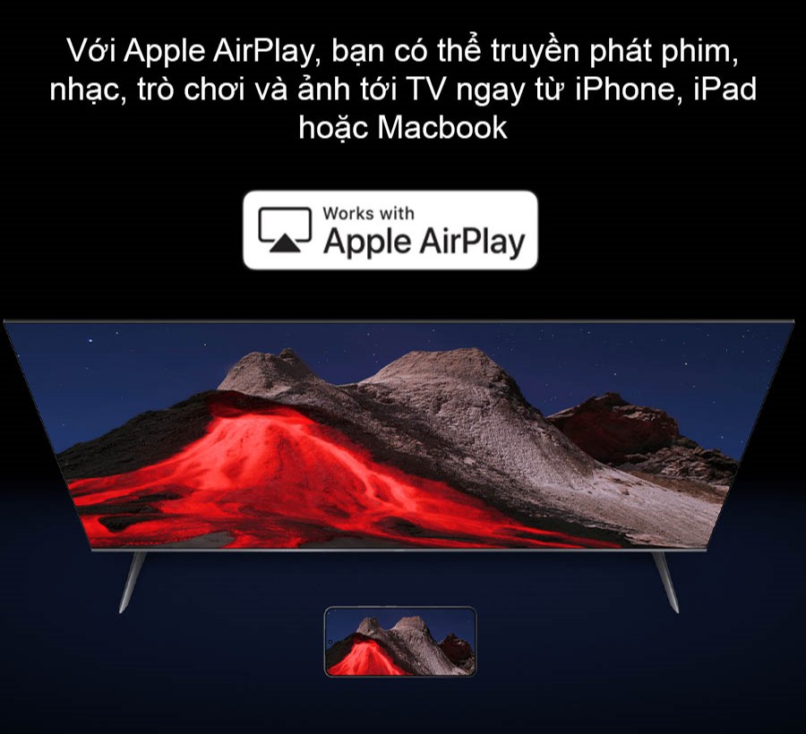 Không chỉ hỗ trợ Android, tivi Xiaomi còn tương thích hoàn hảo với hệ sinh thái Apple thông qua Apple AirPlay. Bạn dễ dàng chia sẻ nội dung yêu thích như phim, nhạc, game, hay hình ảnh từ iPhone, iPad hoặc MacBook lên màn hình lớn, giúp trải nghiệm giải trí thêm phần sống động và thoải mái.