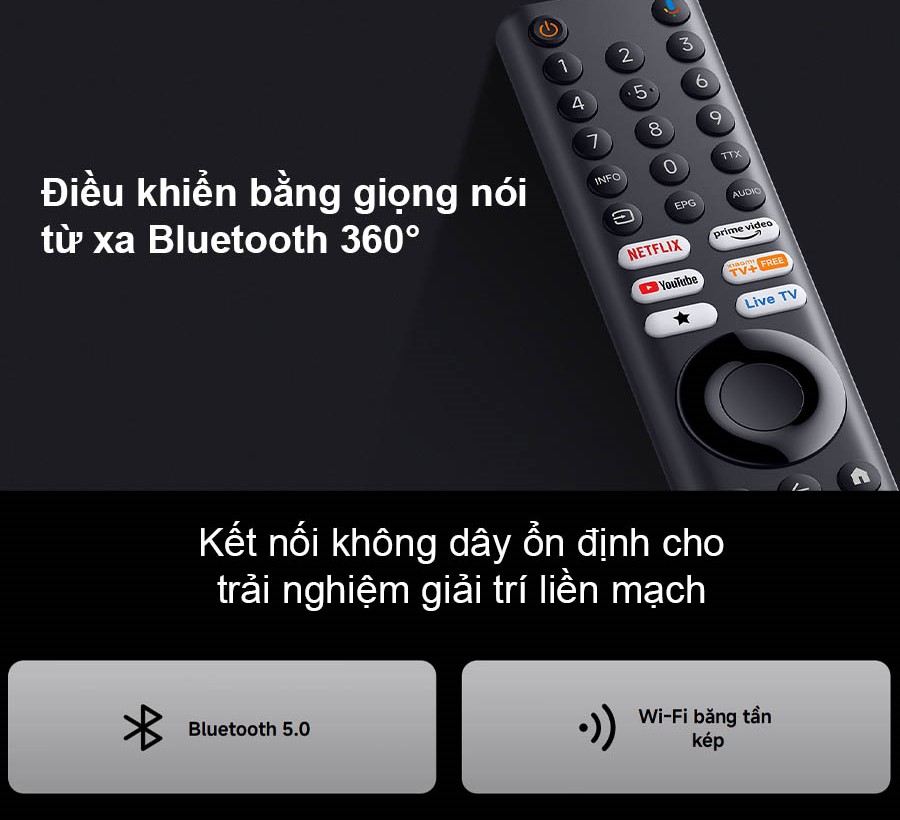 Điều khiển từ xa Bluetooth 360° tiện lợi giúp bạn dễ dàng tìm kiếm và tương tác với TV từ bất kỳ góc độ nào, chỉ bằng giọng nói. Ngoài ra, các phím chức năng trên remote hoàn toàn có thể tùy chỉnh linh hoạt theo thói quen sử dụng, mang tới trải nghiệm điều khiển tiện ích và nhanh chóng nhất.