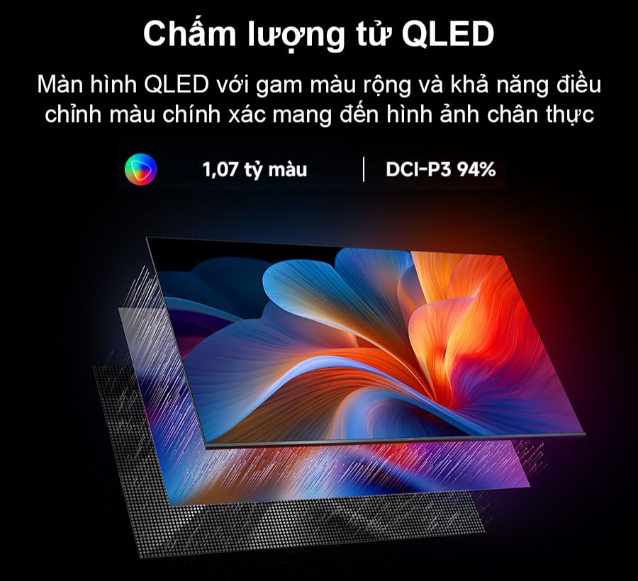 Tivi Xiaomi A Pro 55 inch QLED 2026 sở hữu công nghệ QLED tiên tiến kết hợp chấm lượng tử (Quantum Dot), mang đến dải màu rộng và khả năng tái tạo màu sắc cực kỳ chính xác. Nhờ tích hợp chuẩn màu DCI-P3 - tiêu chuẩn màu sắc trong ngành công nghiệp điện ảnh Hollywood - chiếc tivi này tái hiện hình ảnh với độ rực rỡ và chân thực đầy mê hoặc. Dù là cảnh hoàng hôn dịu nhẹ hay những khung hình hành động rực lửa, tất cả đều trở nên sống động như được nhìn thấy bằng mắt thường.