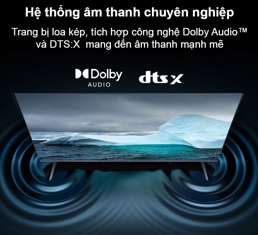 Tivi được trang bị hai loa công suất 10W tích hợp công nghệ Dolby Audio™ và DTS:X, mang đến âm thanh mạnh mẽ, rõ ràng và sống động. Âm trầm sâu, âm cao trong trẻo kết hợp với hiệu ứng âm thanh vòm giúp người dùng đắm chìm trong không gian âm nhạc hoặc hành động gay cấn như đang ngồi trong rạp chiếu phim thực thụ.