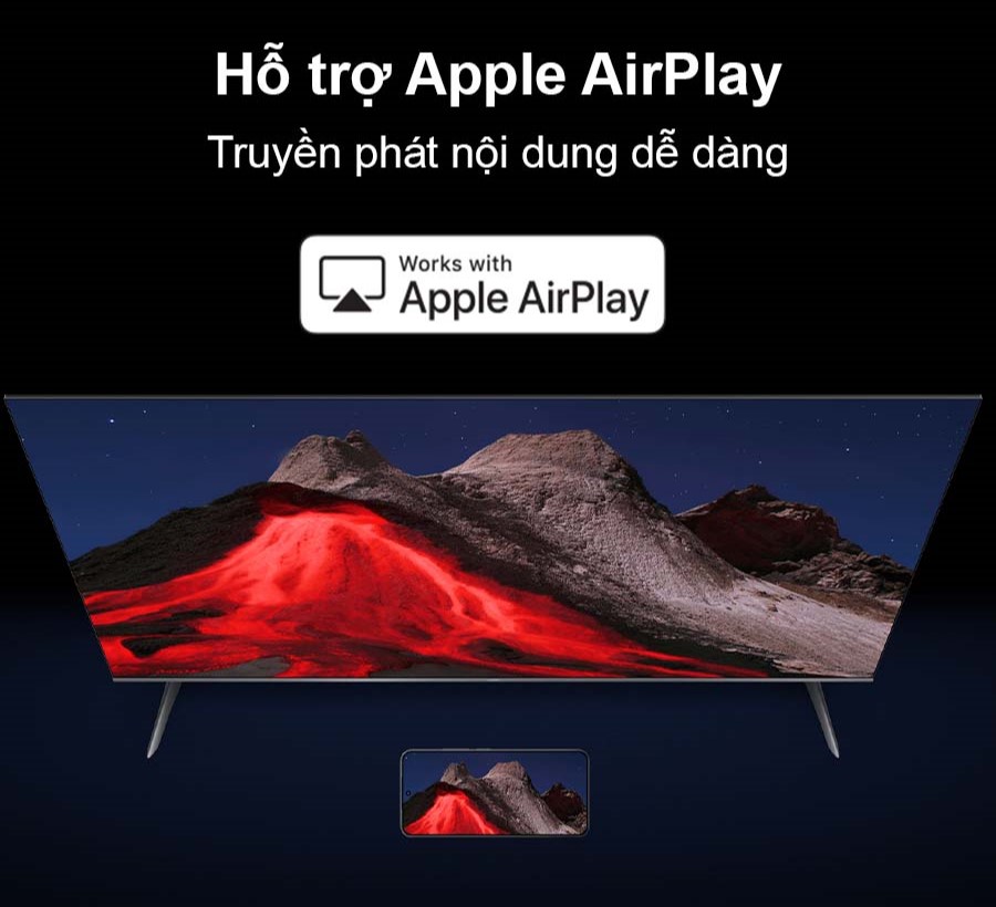 Với sự tích hợp Apple AirPlay, người dùng iPhone, iPad hoặc Mac có thể dễ dàng chia sẻ mọi nội dung yêu thích lên màn hình tivi chỉ trong vài thao tác đơn giản. Tính năng này giúp bạn kết nối liền mạch giữa các thiết bị Apple và mở rộng không gian giải trí cho cả gia đình.