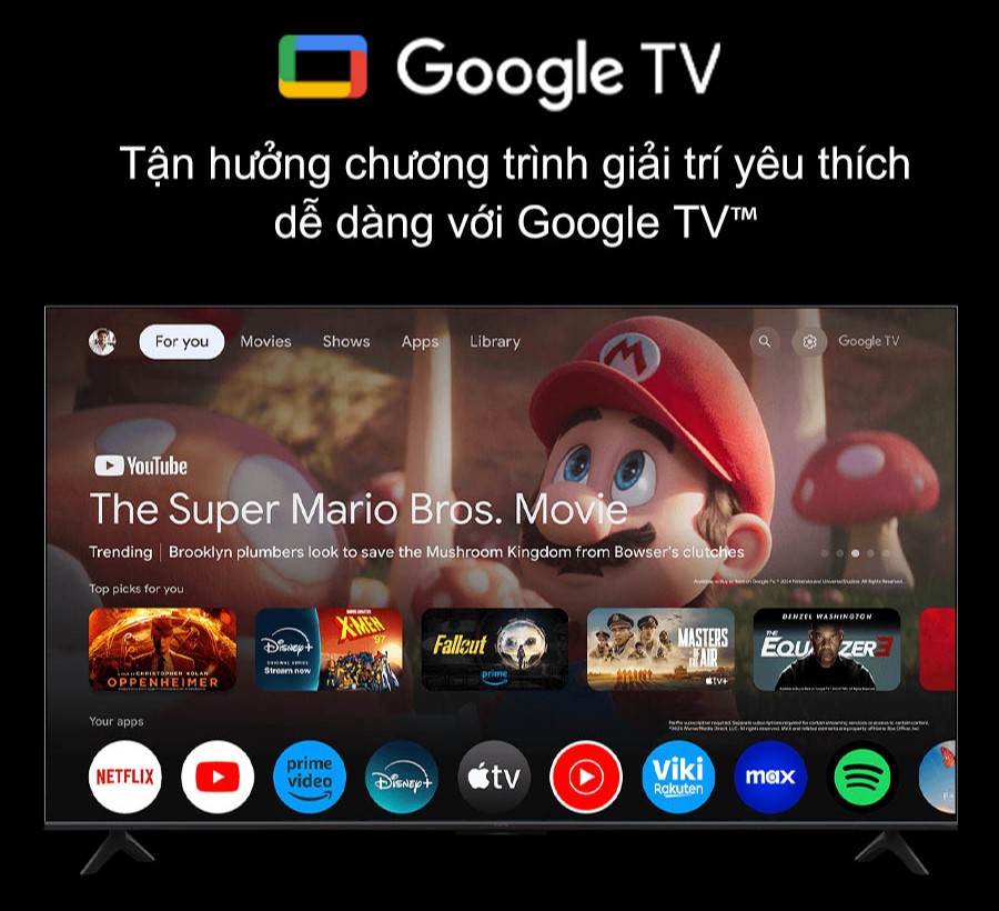 Google TV™ tích hợp phim, chương trình, và nhiều nội dung khác từ các ứng dụng và gói đăng ký của bạn, được sắp xếp gọn gàng để bạn dễ dàng truy cập. Nếu bạn cần cảm hứng, Google TV™ cung cấp các đề xuất được tuyển chọn, cho phép bạn tìm kiếm chương trình qua hơn 10.000 ứng dụng hoặc duyệt qua hàng trăm kênh miễn phí. Với hồ sơ cá nhân hóa, mỗi thành viên trong gia đình đều có được trải nghiệm riêng biệt, được thiết kế theo sở thích của họ.