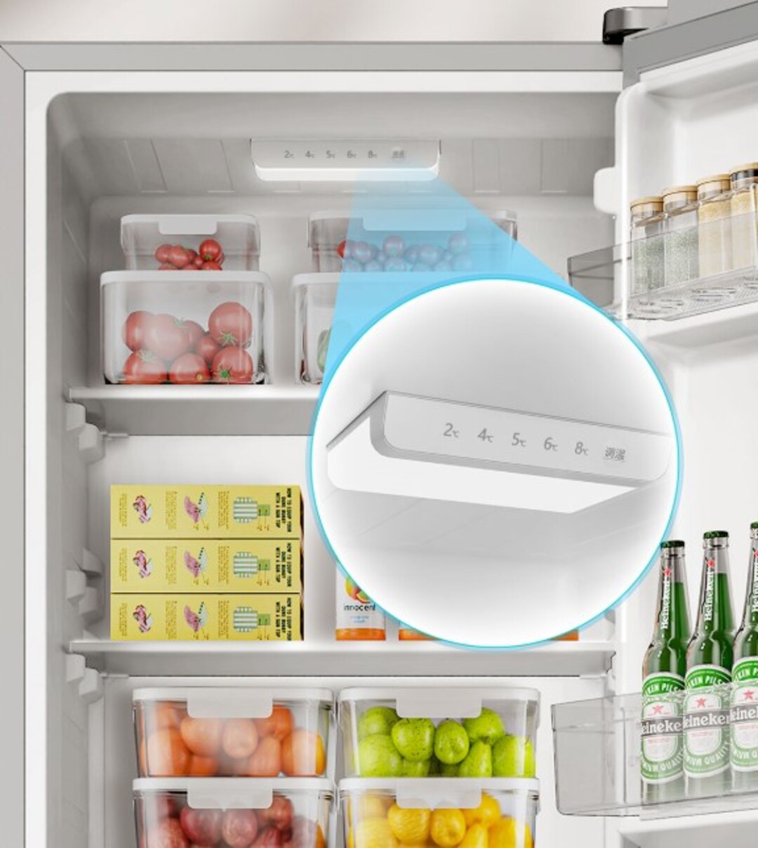 Tủ lạnh Xiaomi Mijia 215L được trang bị hệ thống điều chỉnh nhiệt độ điện tử hiện đại với 5 mức linh hoạt: 2°C, 4°C, 5°C, 6°C và 8°C. Nhờ khả năng kiểm soát nhiệt chính xác, người dùng có thể dễ dàng điều chỉnh theo từng loại thực phẩm và nhu cầu bảo quản khác nhau. Không chỉ giúp duy trì độ tươi ngon, tính năng này còn góp phần nâng cao hiệu quả làm lạnh và tiết kiệm điện năng.