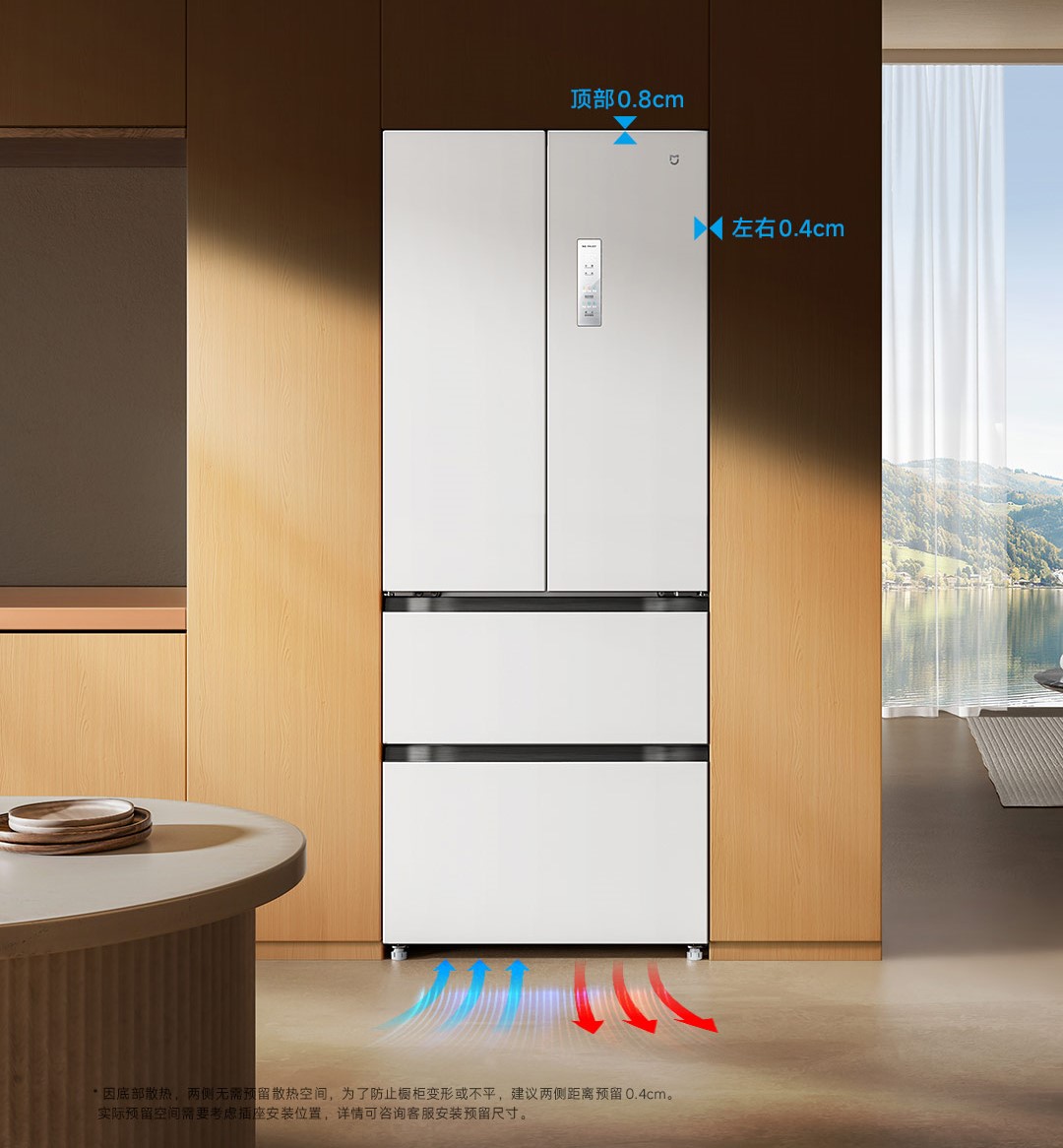 Các dòng tủ lạnh thiết kế âm tường thông thường phải để chừa ra khe hở khá lớn để mở cửa tủ và tản nhiệt. Tuy nhiên, mẫu tủ lạnh Xiaomi Mijia 439L kiểu Pháp đã cải tiến hệ thống tản nhiệt và đặt ở phía dưới chân tủ lạnh. Vì vậy, bạn không cần phải để khoảng trống tản nhiệt ở cả hai bên, mang lại tính thẩm mỹ cao nhất cho tủ lạnh Xiaomi.