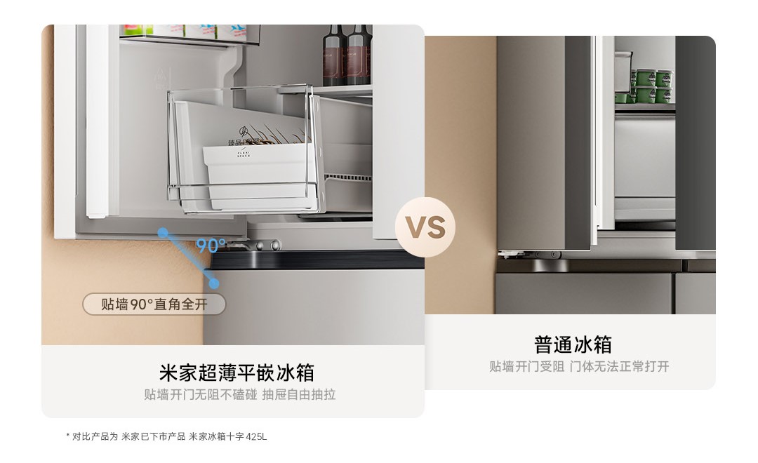 Một điểm nổi bật của Xiaomi Mijia 439L là tủ sở hữu thiết kế bản lề tiên tiến giúp cửa tủ có thể mở hoàn toàn ở góc 90° dù bị tường chặn.