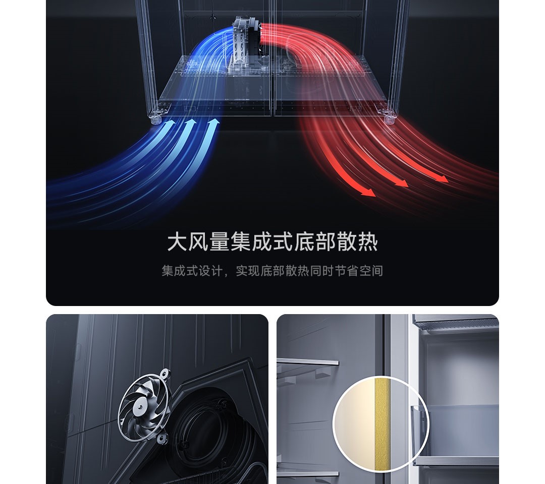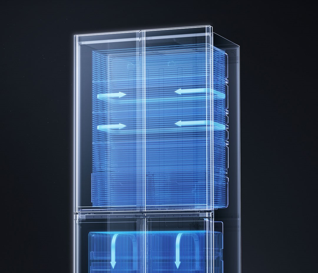 Tủ lạnh Xiaomi Mijia 508L Pro Bản Pha lê được trang bị quạt làm lạnh siêu mỏng với độ dày chỉ 20mm nhưng vẫn duy trì hiệu suất mạnh mẽ. Hệ thống quạt này tạo ra lưu lượng gió lớn lên đến 1.094m³/phút, giúp tạo luồng khí lạnh luân chuyển nhanh chóng và đồng đề trong tủ. Nhờ đó, thực phẩm được bảo quản trong môi trường nhiệt độ ổn định, giữ được độ tươi ngon lâu hơn.