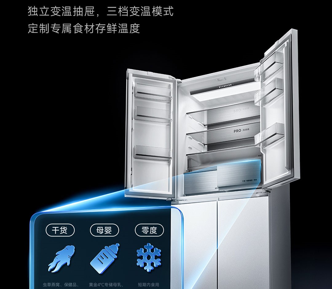 Tủ lạnh Xiaomi Mijia 508L Pro Bản Pha lê được trang bị ngăn kéo thay đổi nhiệt độ độc lập, hỗ trợ ba chế độ điều chỉnh linh hoạt theo nhu cầu bảo quản thực phẩm. Người dùng có thể tùy chỉnh mức nhiệt phù hợp với từng loại thực phẩm như đồ khô, thực phẩm dành cho mẹ và bé hoặc các sản phẩm chăm sóc sức khỏe. Đặc biệt, chế độ bảo quản sữa mẹ ở mức nhiệt lý tưởng 4°C giúp giữ trọn dưỡng chất, phù hợp với nhu cầu sử dụng ngắn hạn, đảm bảo an toàn và tiện lợi cho cả gia đình.