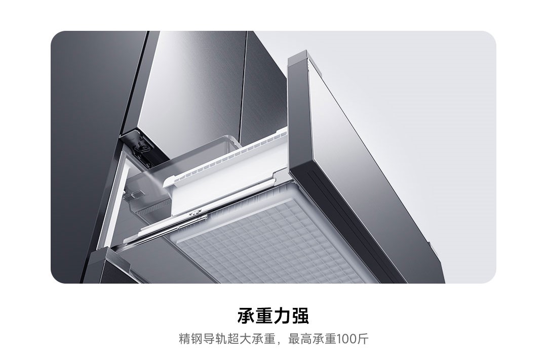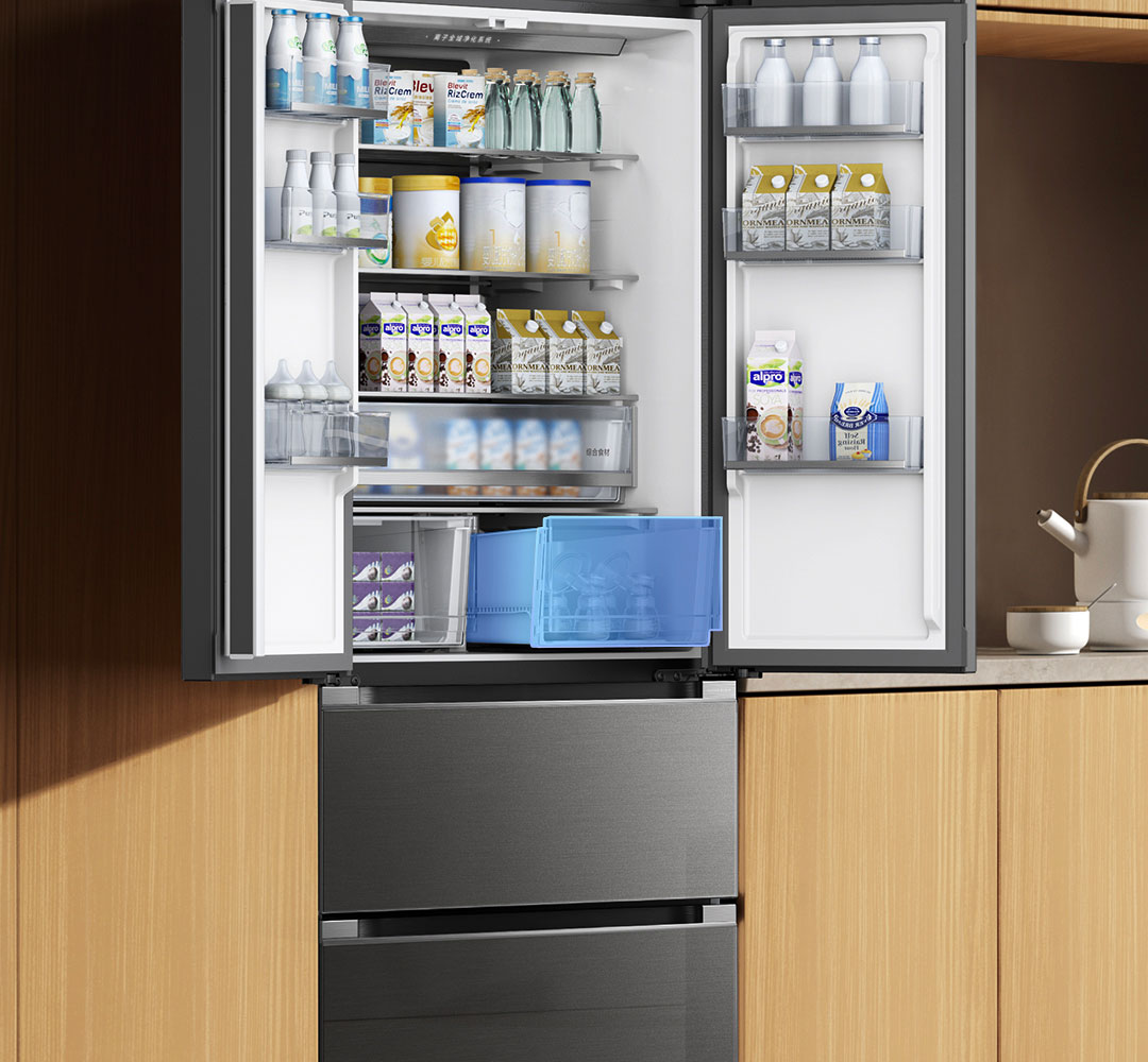 Tủ lạnh Xiaomi Mijia 508L Pro sở hữu bố cục kiểu Pháp mới với ngăn kéo đông cực rộng lên đến 65cm, thiết kế sâu và mở trực tiếp hai tầng, cho phép bảo quản thực phẩm cỡ lớn như sườn bò tomahawk, chân cừu, dẻ sườn mà không cần chia nhỏ. Dù là pizza, bánh bao hay các món đông lạnh khác, tất cả đều có thể đặt nằm thoải mái mà không bị ép hay xô lệch.