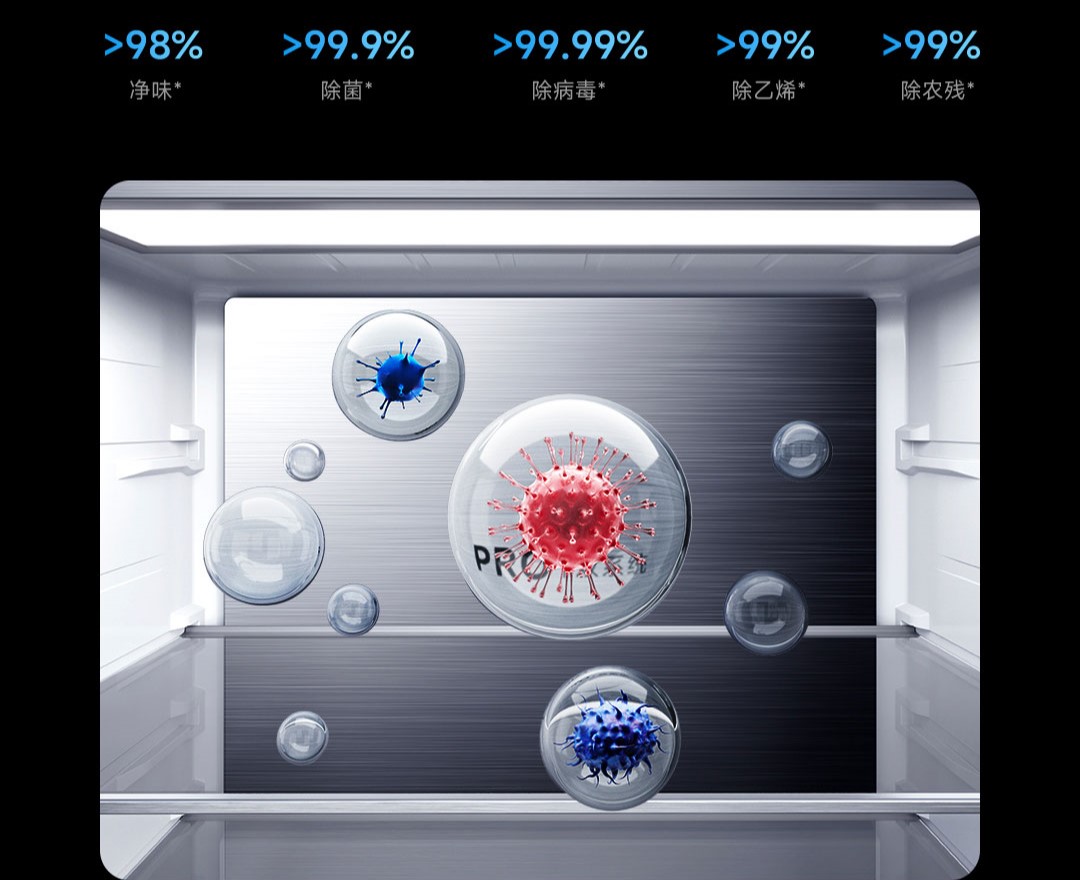 Tủ lạnh Xiaomi Mijia 508L Pro sở hữu hệ thống khử khuẩn và khử mùi toàn diện bằng ion, hoạt động chủ động trên cả ngăn mát và ngăn đông. Nhờ tích hợp máy tạo ion âm – dương trong ống dẫn khí, tủ lạnh có khả năng lọc sạch không khí bên trong mà không chiếm thêm không gian, giúp khử trùng nhanh chóng và hiệu quả.