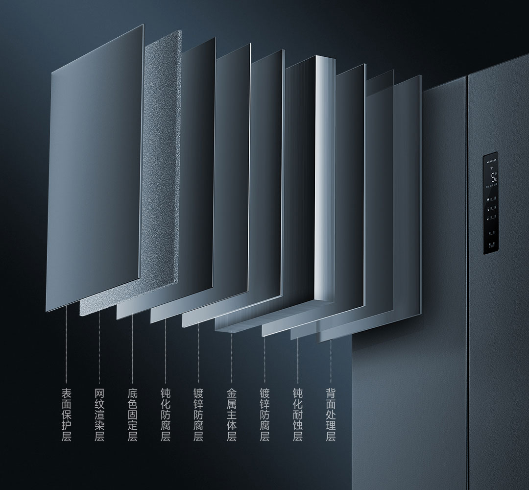 Tủ lạnh 4 cánh Xiaomi 606L sử dụng kết cấu đá tự nhiên, bằng việc sử dụng công nghệ ion cacbon nóng chảy cùng với 9 lớp vật liệu được đánh bóng tinh xảo. Tạo nên kết cấu đá thô có độ bóng tự nhiên và độ cứng cao, hạn chế trầy xước. Ngoài ra bề mặt đá này còn kết hợp với kim loại cho phép bạn có thể sử dụng nam châm trên bề mặt. Mijia 606L sử dụng bảng điều khiển nhiệt độ cảm ứng cực nhạy và dễ dàng sử dụng.